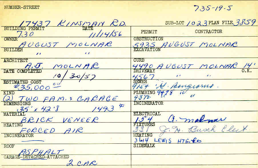 17437 Chagrin Boulevard Shaker Heights, OH 44120 PARCEL ID: 735-19-005 Building Permit Date: 11-14-1956 Plan File Number: 3859 Microfilm Roll: Roll#56 Neighborhood: Lomond Owner: Molnar, August Builder: Molnar, August Architect: Molnar, A. J. Estimated Cost: 35,000 Date Completed: 10-30-1957 Kind: Duplex or Two-Family and Garage Material: Brick Veneer Heating: Forced Air Roof: Asphalt Garage: detached 2 car |