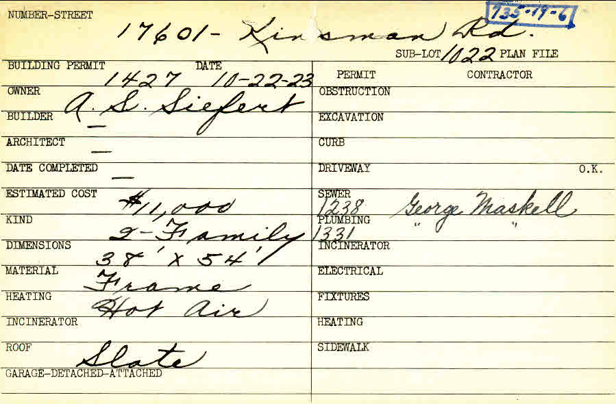 17601 Chagrin Boulevard Shaker Heights, OH 44120 PARCEL ID: 735-19-006 Building Permit Date: 10-22-1923 Plan File Number: 4310 scanned, 5953 Microfilm Roll: Roll062, Roll#80 Neighborhood: Lomond Owner: Siefert, A. S. Estimated Cost: 11000 Kind: Duplex or Two-Family Material: Frame Heating: Hot Air Roof: Slate |