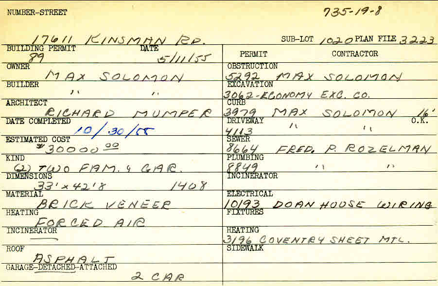17611 Chagrin Boulevard Shaker Heights, OH 44120 PARCEL ID: 735-19-008 Building Permit Date: 05-11-1955 Plan File Number: 3223 Microfilm Roll: Roll#47 Neighborhood: Lomond Owner: Solomon, Max Builder: Solomon, Max Architect: Mumper, Richard Estimated Cost: 30000 Date Completed: 10-30-1955 Kind: Duplex or Two-Family and Garage Material: Brick Veneer Heating: Forced Air Roof: Asphalt Garage: detached 2 car |