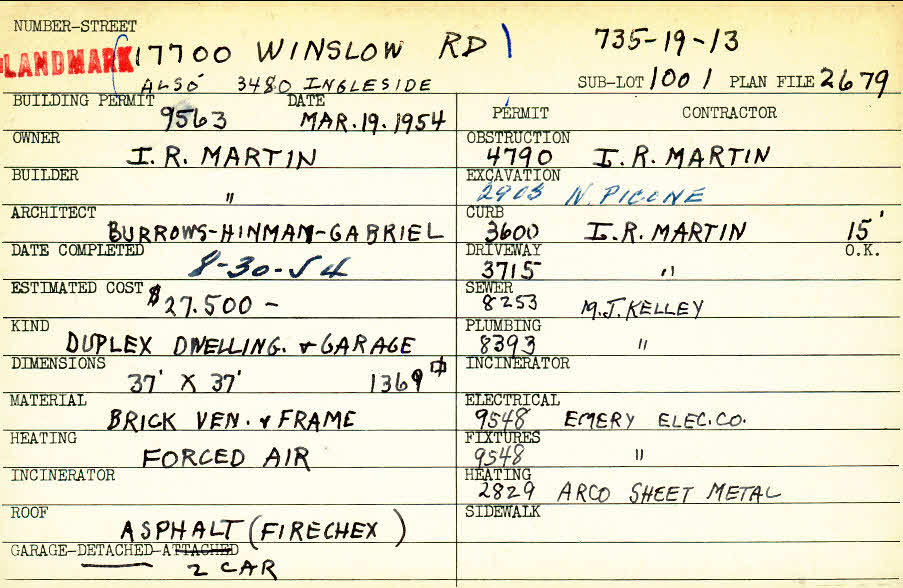 17700 Winslow Road Shaker Heights, OH 44120 PARCEL ID: 735-19-013 Building Permit Date: 03-19-1954 Plan File Number: 2679 Microfilm Roll: Roll #37 Neighborhood: Lomond Owner: Martin, I. R. Builder: Martin, I. R. Architect: Burrows, Hinman, Gabriel Estimated Cost: 27500 Date Completed: 08-30-1954 Kind: Duplex or Two-Family and Garage Material: Brick Veneer and Frame Heating: Forced Air Roof: Asphalt Garage: detached 2 car |