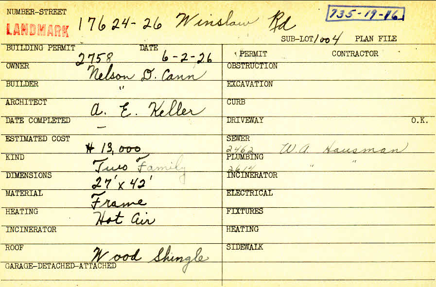 17624 Winslow Road Shaker Heights, OH 44120 PARCEL ID: 735-19-016 Building Permit Date: 06-02-1926 Plan File Number: 0 Owner: Cann, Nelson D. Builder: Cann, Nelson D. Architect: Keller, Arthur Emil Estimated Cost: 13000 Kind: Duplex or Two-Family Material: Frame Heating: Hot Air Roof: Wood Shingle |