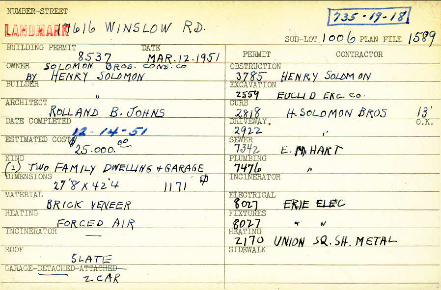 17616 Winslow Road Shaker Heights, OH 44120 PARCEL ID: 735-19-018 Building Permit Date: 03-12-1951 Plan File Number: 1589 all scanned Microfilm Roll: Roll025 Owner: Solomon Brothers Construction Company by Henry Solomon Builder: Solomon Brothers Construction Company by Henry Solomon Architect: Johns, Rolland B. Estimated Cost: 25000 Date Completed: 12-14-1951 Kind: Duplex or Two-Family and Garage Material: Brick Veneer Heating: Forced Air Roof: Slate Garage: detached 2 car |