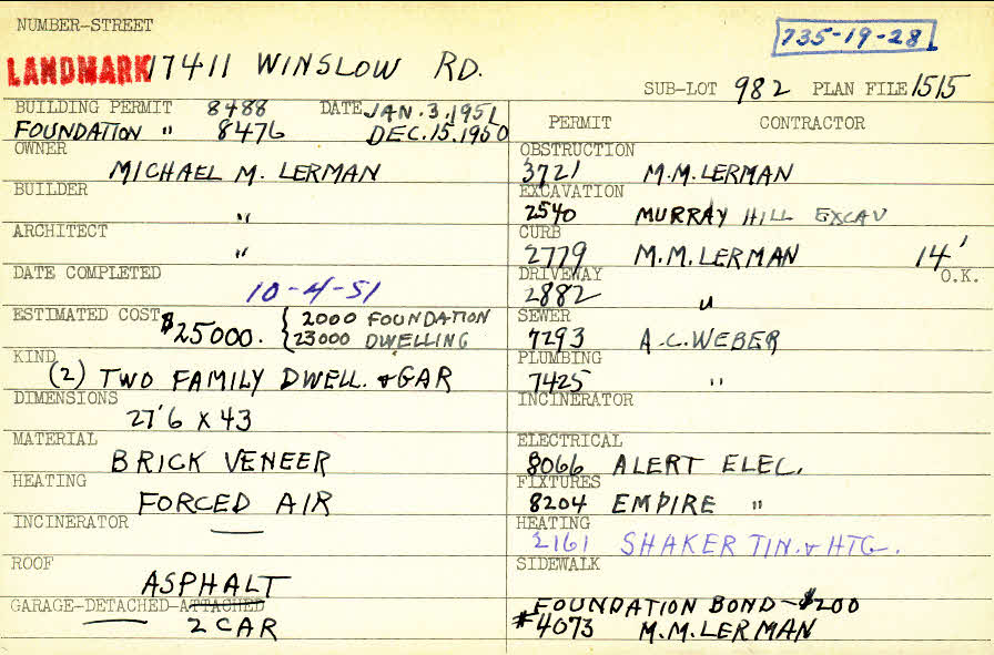 17411 Winslow Road Shaker Heights, OH 44120 PARCEL ID: 735-19-028 Building Permit Date: 12-15-1950 Plan File Number: 1515 all scanned Microfilm Roll: Roll024 Owner: Lerman, Michael M. Builder: Lerman, Michael M. Architect: Lerman, Michael M. Estimated Cost: 25000 Date Completed: 10-04-1951 Kind: Duplex or Two-Family and Garage Material: Brick Veneer Heating: Forced Air Roof: Asphalt Garage: detached 2 car |