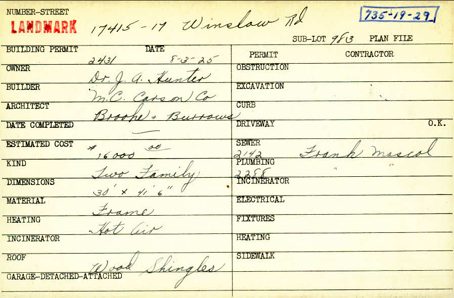 17415 Winslow Road Shaker Heights, OH 44120 PARCEL ID: 735-19-029 Building Permit Date: 08-03-1925 Plan File Number: 0 Neighborhood: Lomond Owner: Hunter, Dr. J. A. Builder: M. C. Carson Company Architect: Brooke and Burrows Estimated Cost: 16000 Kind: Duplex or Two-Family Material: Frame Heating: Hot Air Roof: Wood Shingle |