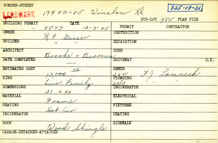 17423 Winslow Road Shaker Heights, OH 44120 PARCEL ID: 735-19-031 Building Permit Date: 10-03-1925 Owner: Gaiser, R. F. Builder: Gaiser, R. F. Architect: Brooke and Burrows Estimated Cost: 13000 Kind: Duplex or Two-Family Material: Frame Heating: Hot Air Roof: Wood Shingle Blueprints: no blueprints on microfilm |
