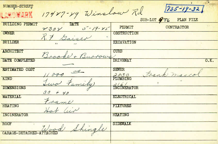17427 Winslow Road Shaker Heights, OH 44120 PARCEL ID: 735-19-032 Building Permit Date: 05-19-1925 Plan File Number: 0 Neighborhood: Lomond Owner: Gaiser, R. F. Builder: Gaiser, R. F. Architect: Brooke and Burrows Estimated Cost: 11000 Kind: Duplex or Two-Family Material: Frame Heating: Hot Air Roof: Wood Shingle |
