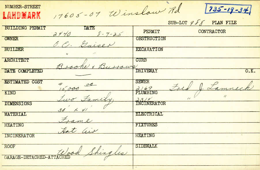 17605 Winslow Road Shaker Heights, OH 44120 PARCEL ID: 735-19-034 Building Permit Date: 08-07-1925 Plan File Number: 0 Neighborhood: Lomond Owner: Gaiser, O. E. Builder: Gaiser, O. E. Architect: Brooke and Burrows Estimated Cost: 15000 Kind: Duplex or Two-Family Material: Frame Heating: Hot Air Roof: Wood Shingle |