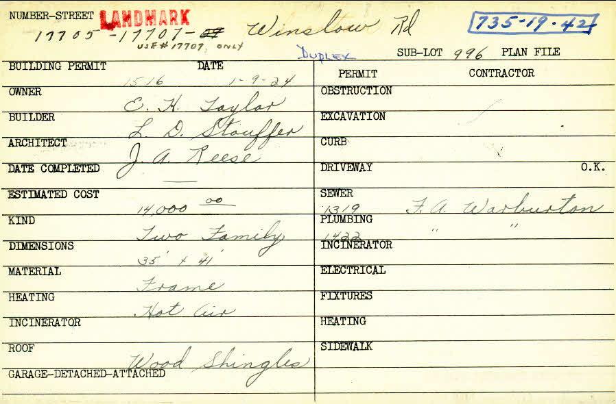 17705 Winslow Road Shaker Heights, OH 44122 PARCEL ID: 735-19-042 Building Permit Date: 01-09-1924 Plan File Number: 12919 all scanned Microfilm Roll: NewRoll19 Owner: Taylor, E. H. Builder: Stouffer, L. D. Architect: Reese, James A. Estimated Cost: 14000 Kind: Duplex or Two-Family Material: Frame Heating: Hot Air Roof: Wood Shingle |
