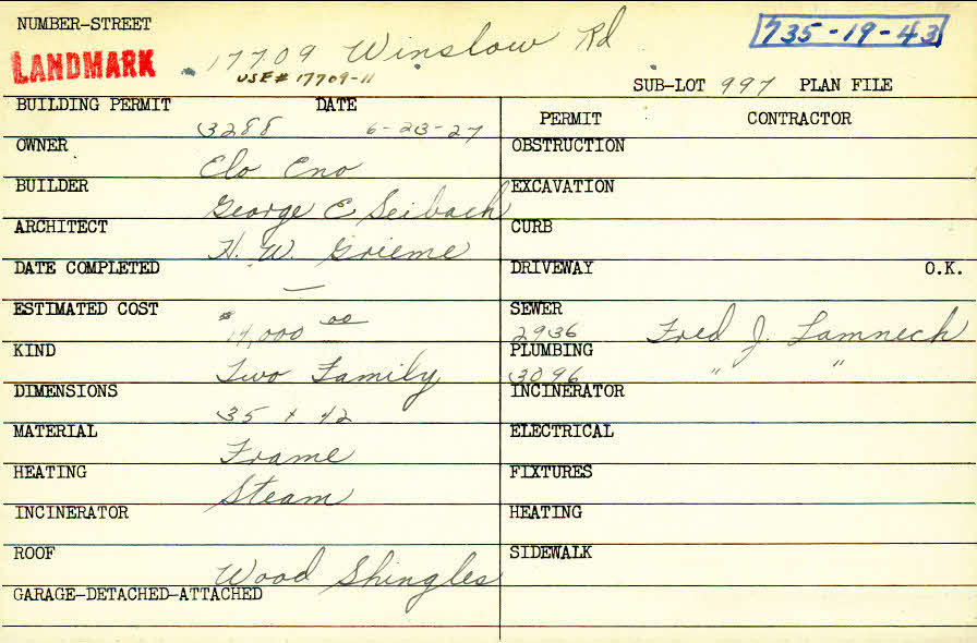 17709 Winslow Road Shaker Heights, OH 44122 PARCEL ID: 735-19-043 Building Permit Date: 06-23-1927 Plan File Number: 0 Neighborhood: Lomond Owner: Eno, Elo Builder: Siebach, George E. Architect: Grieme, H. W. Estimated Cost: 14000 Kind: Duplex or Two-Family Material: Frame Heating: Steam Roof: Wood Shingle |