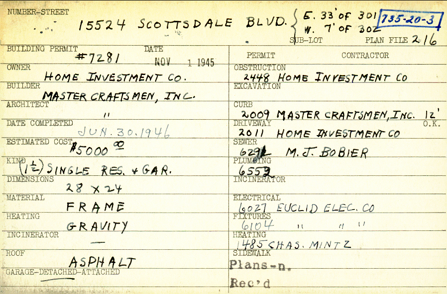 15524 Scottsdale Boulevard Shaker Heights, OH 44120 PARCEL ID: 735-20-003 Building Permit Date: 11-01-1945 Plan File Number: 216, 707 all scanned Microfilm Roll: Roll002, Roll010 Owner: Home Investment Company Builder: Master Craftsmen Inc Architect: Master Craftsmen Inc Estimated Cost: 5000 Date Completed: 06-30-1946 Kind: Single Dwelling and Garage Material: Frame Heating: Gravity System Roof: Asphalt Garage: detached |