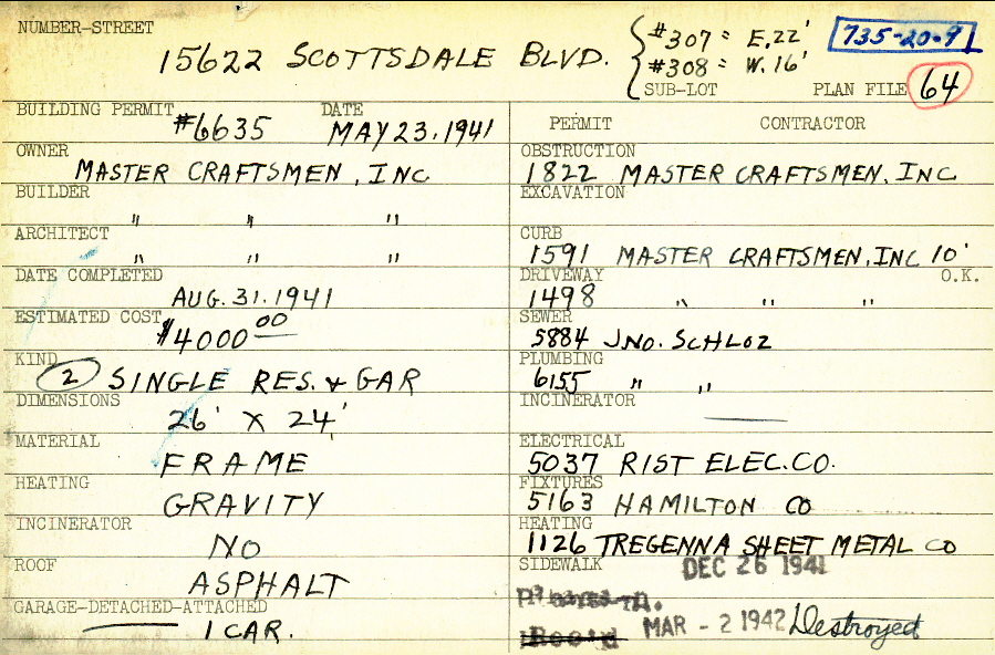 15622 Scottsdale Boulevard Shaker Heights, OH 44120 PARCEL ID: 735-20-009 Building Permit Date: 05-23-1941 Plan File Number: 64 Neighborhood: Moreland Owner: Master Craftsmen Inc Builder: Master Craftsmen Inc Architect: Master Craftsmen Inc Estimated Cost: 4000 Date Completed: 08-31-1941 Kind: Single, Single Residence or Dwelling (2) Material: Frame Heating: Gravity System Roof: Asphalt Garage: detached Card Available: yes |