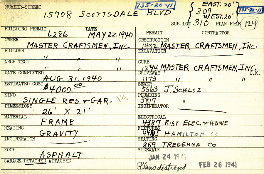 15708 Scottsdale Boulevard Shaker Heights, OH 44120 PARCEL ID: 735-20-011 Building Permit Date: 05-22-1940 Plan File Number: 124, 10869 Microfilm Roll: NewRoll#6 Neighborhood: Moreland Owner: Master Craftsmen Inc Builder: Master Craftsmen Inc Architect: Master Craftsmen Inc Estimated Cost: 4000 Date Completed: 08-31-1940 Kind: Single Dwelling and Garage Material: Frame Heating: Gravity System Roof: Asphalt Garage: detached |