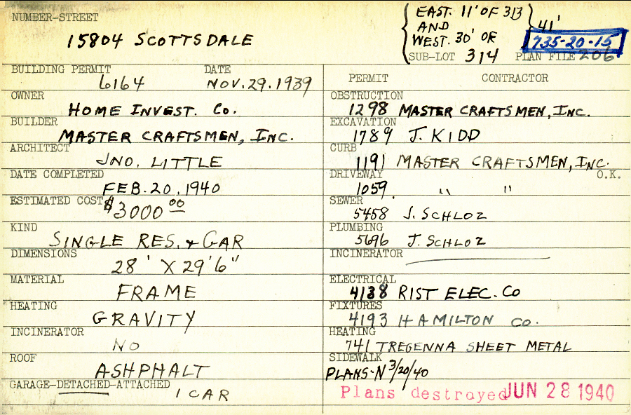 15804 Scottsdale Boulevard Shaker Heights, OH 44120 PARCEL ID: 735-20-015 Building Permit Date: 11-29-1939 Plan File Number: 206 Owner: Home Investment Company Builder: Master Craftsmen Inc Architect: Little, John W. Estimated Cost: 3000 Date Completed: 02-20-1940 Kind: Single Dwelling and Garage Material: Frame Heating: Gravity System Roof: Asphalt Garage: detached |