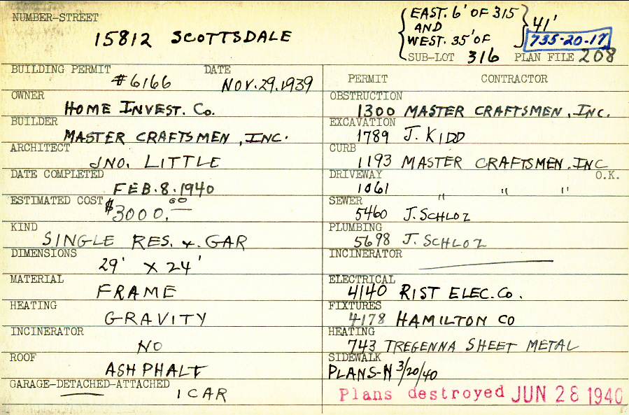 15812 Scottsdale Boulevard Shaker Heights, OH 44120 PARCEL ID: 735-20-017 Building Permit Date: 11-29-1939 Plan File Number: 988 all scanned Microfilm Roll: Roll012 Owner: Home Investment Company Builder: Master Craftsmen Inc Architect: Little, John W. Estimated Cost: 3000 Date Completed: 02-08-1940 Kind: Single Dwelling and Garage Material: Frame Heating: Gravity System Roof: Asphalt Garage: detached |