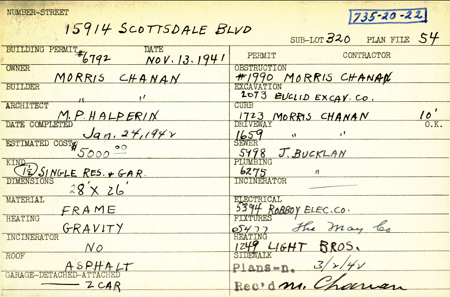 15914 Scottsdale Boulevard Shaker Heights, OH 44120 PARCEL ID: 735-20-022 Building Permit Date: 11-13-1941 Plan File Number: 54 Neighborhood: Moreland Owner: Chanan, Morris Builder: Chanan, Morris Architect: Halperin, M. P. Estimated Cost: 5000 Date Completed: 01-24-1942 Kind: Single Dwelling and Garage Material: Frame Heating: Gravity System Roof: Asphalt Garage: detached 2 car |