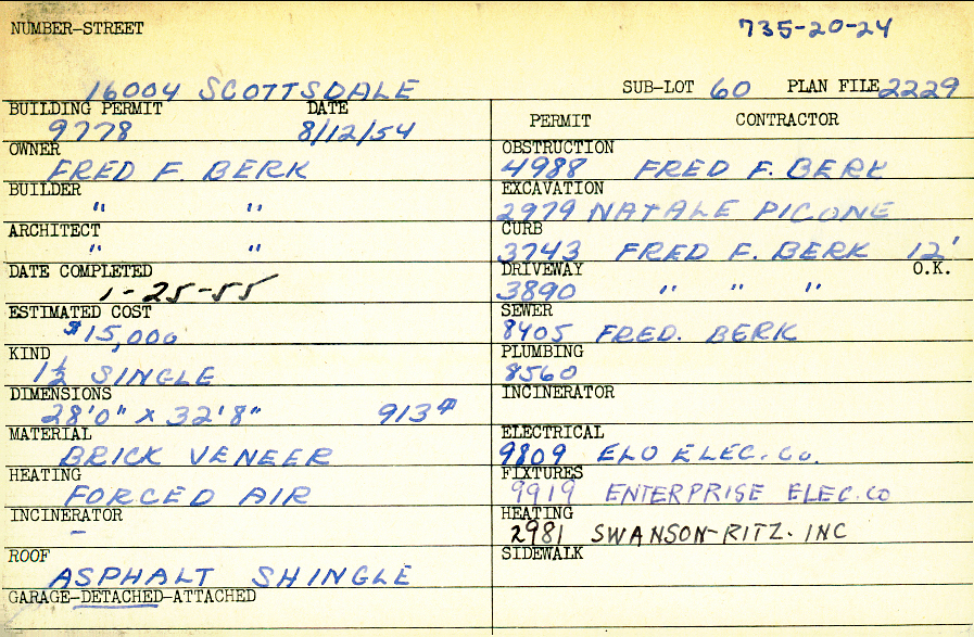 16004 Scottsdale Boulevard Shaker Heights, OH 44120 PARCEL ID: 735-20-024 Building Permit Date: 08-12-1954 Plan File Number: 2229 Microfilm Roll: Roll#33 Neighborhood: Moreland Owner: Berk, Fred F. Builder: Berk, Fred F. Architect: Berk, Fred F. Estimated Cost: 15000 Date Completed: 01-25-1955 Kind: Single, Single Residence or Dwelling Material: Brick Veneer Heating: Forced Air Roof: Asphalt Shingles Garage: detached |