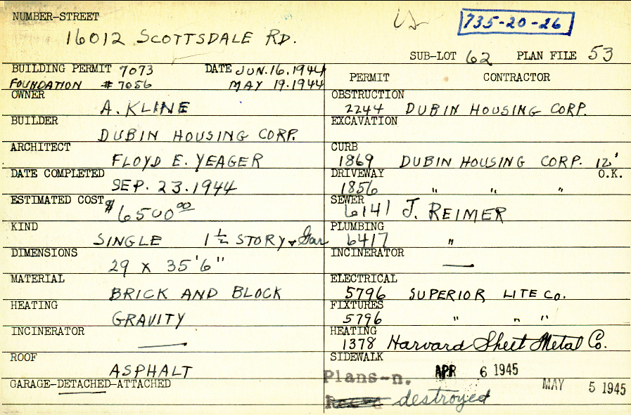16012 Scottsdale Boulevard Shaker Heights, OH 44120 PARCEL ID: 735-20-026 Building Permit Date: 05-19-1944 Plan File Number: 53, 6800 Microfilm Roll: Roll#88 Neighborhood: Moreland Owner: Kline, A. Builder: Dubin Housing Corporation Architect: Yeager, Floyd E. Estimated Cost: 6500 Date Completed: 09-23-1944 Kind: Single Dwelling and Garage Material: Brick and Block Heating: Gravity System Roof: Asphalt Garage: detached |
