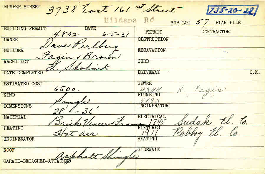 3738 Hildana Road Shaker Heights, OH 44120 PARCEL ID: 735-20-029 Building Permit Date: 06-05-1931 Neighborhood: Moreland Owner: Perlberg, Dave Builder: Fagin and Brown Architect: Skolnik, Louis Estimated Cost: 6500 Kind: Single, Single Residence or Dwelling Material: Brick Veneer and Frame Heating: Hot Air Roof: Asphalt Shingles Blueprints: no blueprints on microfilm |