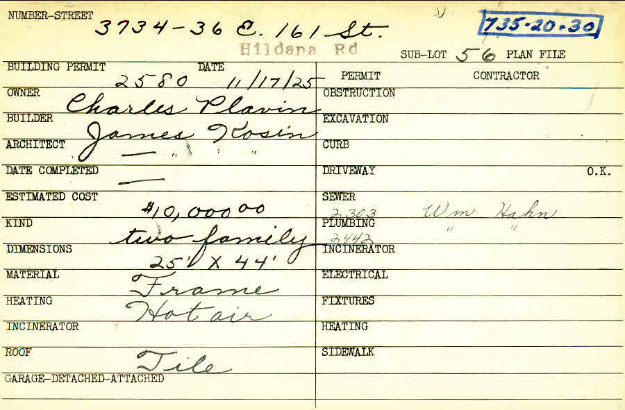 3736 Hildana Road Shaker Heights, OH 44120 PARCEL ID: 735-20-030 Building Permit Date: 11-17-1925 Plan File Number: 0 Neighborhood: Moreland Owner: Plavin, Charles Builder: Kosin, James Estimated Cost: 10000 Kind: Duplex or Two-Family Material: Frame Heating: Hot Air Roof: Tile Card Available: yes |