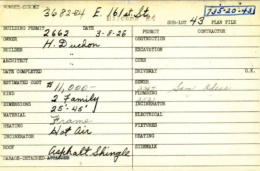 3682 Hildana Road Shaker Heights, OH 44120 PARCEL ID: 735-20-043 Building Permit Date: 03-08-1926 Plan File Number: 137 all scanned Microfilm Roll: Roll001 Neighborhood: Moreland Owner: Duchon, H. Builder: Duchon, H. Architect: Duchon, H. Estimated Cost: 11000 Kind: Duplex or Two-Family Material: Frame Heating: Hot Air Roof: Asphalt Shingles Garage: detached |
