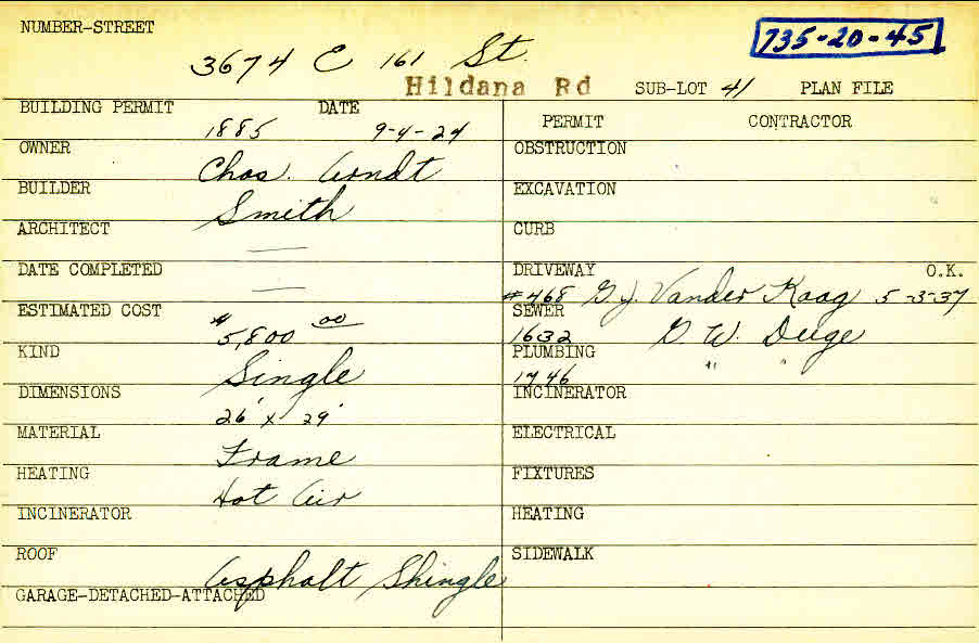 3674 Hildana Road Shaker Heights, OH 44120 PARCEL ID: 735-20-045 Building Permit Date: 09-04-1924 Plan File Number: 0 Neighborhood: Moreland Owner: Arndt, Charles Builder: Smith Estimated Cost: 5800 Kind: Single, Single Residence or Dwelling Material: Frame Heating: Hot Air Roof: Asphalt Shingles Card Available: yes |