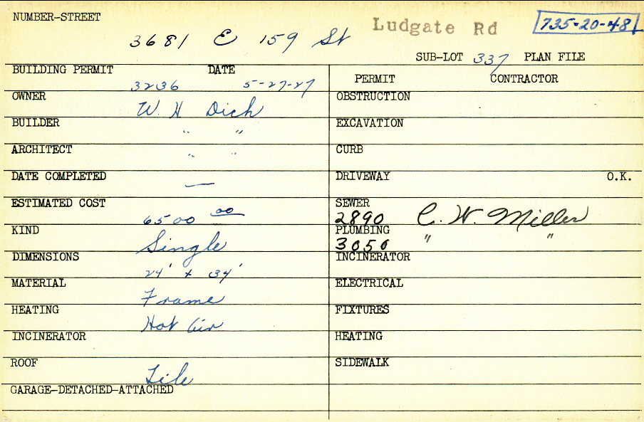 3681 Ludgate Road Shaker Heights, OH 44120 PARCEL ID: 735-20-048 Building Permit Date: 05-27-1927 Plan File Number: 0 Neighborhood: Moreland Owner: Dick, W. H. Builder: Dick, W. H. Architect: Dick, W. H. Estimated Cost: 6500 Kind: Single, Single Residence or Dwelling Material: Frame Heating: Hot Air Roof: Tile Card Available: yes |