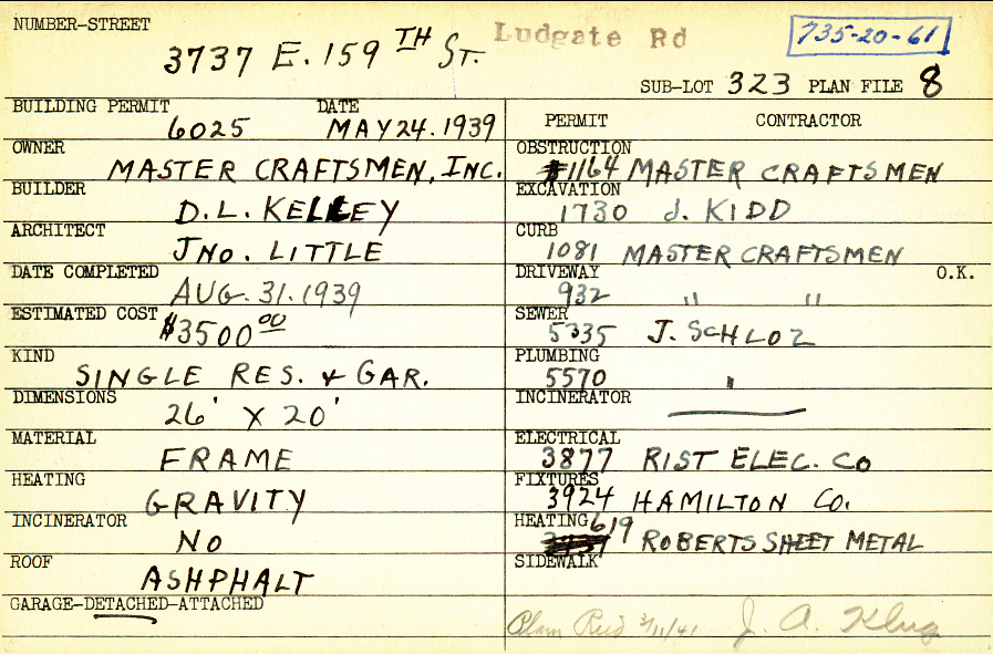 3737 Ludgate Road Shaker Heights, OH 44120 PARCEL ID: 735-20-061 Building Permit Date: 05-24-1939 Plan File Number: 8 Neighborhood: Moreland Owner: Master Craftsmen, Inc. Builder: Kelley, D. L. Architect: Little, John W. Estimated Cost: 3500 Date Completed: 08-31-1939 Kind: Single Dwelling and Garage Material: Frame Heating: Gravity System Roof: Asphalt Garage: detached |