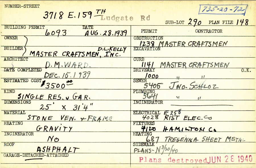 3718 Ludgate Road Shaker Heights, OH 44120 PARCEL ID: 735-20-072 Building Permit Date: 08-28-1939 Plan File Number: 148 Neighborhood: Moreland Owner: Master Craftsmen, Inc., D. L. Kelly Builder: Master Craftsmen, Inc., D. L. Kelly Architect: Ward, D. M. Estimated Cost: 3500 Date Completed: 12-15-1939 Kind: Single Dwelling and Garage Material: Stone Veneer and Frame Heating: Gravity System Roof: Asphalt Garage: detached |