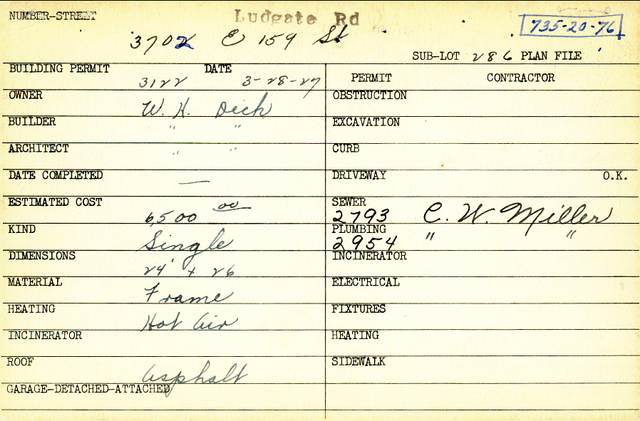3702 Ludgate Road Shaker Heights, OH 44120 PARCEL ID: 735-20-076 Building Permit Date: 03-28-1927 Plan File Number: 0 Neighborhood: Moreland Owner: Dick, W. H. Builder: Dick, W. H. Architect: Dick, W. H. Estimated Cost: 6500 Kind: Single, Single Residence or Dwelling Material: Frame Heating: Hot Air Roof: Asphalt Card Available: yes |