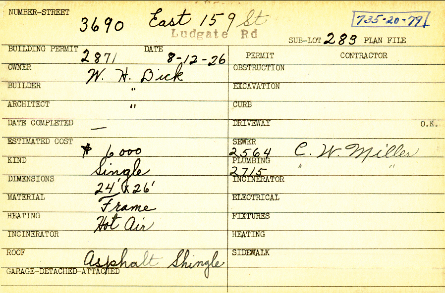 3690 Ludgate Road Shaker Heights, OH 44120 PARCEL ID: 735-20-079 Building Permit Date: 08-12-1926 Plan File Number: 0 Neighborhood: Moreland Owner: Dick, W. H. Builder: Dick, W. H. Architect: Dick, W. H. Estimated Cost: 6000 Kind: Single, Single Residence or Dwelling Material: Frame Heating: Hot Air Roof: Asphalt Shingles Card Available: yes |