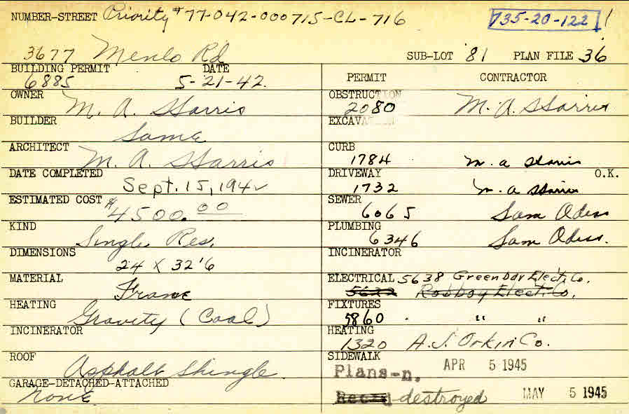 3677 Menlo Road Shaker Heights, OH 44120 PARCEL ID: 735-20-122 Building Permit Date: 05-21-1942 Neighborhood: Moreland Owner: Harris, M. A. Builder: Harris, M. A. Architect: Harris, M. A. Estimated Cost: 4500 Date Completed: 09-15-1942 Kind: Single, Single Residence or Dwelling Material: Frame Heating: Gravity System Roof: Asphalt Shingles Blueprints: no blueprints on microfilm |