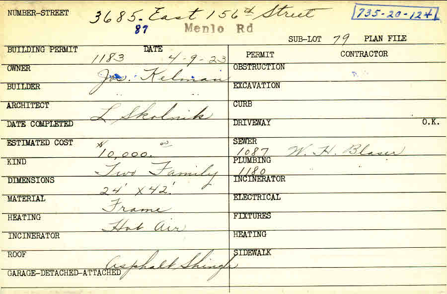3685 Menlo Road Shaker Heights, OH 44120 PARCEL ID: 735-20-124 Building Permit Date: 04-09-1923 Plan File Number: 12740 Microfilm Roll: NewRoll#14 Neighborhood: Moreland Owner: Kelman, Joseph Builder: Kelman, Joseph Architect: Skolnik, Louis Estimated Cost: 10000 Kind: Duplex or Two-Family Material: Frame Heating: Hot Air Roof: Asphalt Shingles |
