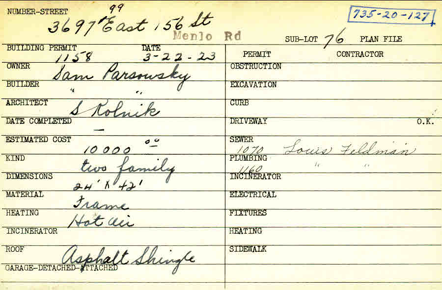 3697 Menlo Road Shaker Heights, OH 44120 PARCEL ID: 735-20-127 Building Permit Date: 03-22-1923 Neighborhood: Moreland Owner: Parsowsky, Sam Builder: Parsowsky, Sam Architect: Skolnik, Louis Estimated Cost: 10000 Kind: Duplex or Two-Family Material: Frame Heating: Hot Air Roof: Asphalt Shingles Blueprints: no blueprints on microfilm |