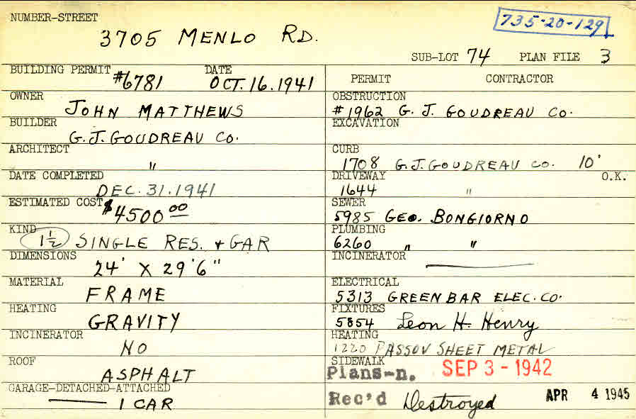 3705 Menlo Road Shaker Heights, OH 44120 PARCEL ID: 735-20-129 Building Permit Date: 10-16-1941 Neighborhood: Moreland Owner: Matthews, John Builder: G. J. Goudreau Company Architect: G. J. Goudreau Company Estimated Cost: 4500 Date Completed: 12-31-1941 Kind: Single Dwelling and Garage Material: Frame Heating: Gravity System Roof: Asphalt Garage: detached Blueprints: no blueprints on microfilm |