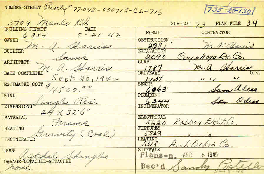 3709 Menlo Road Shaker Heights, OH 44120 PARCEL ID: 735-20-130 Building Permit Date: 05-21-1942 Neighborhood: Moreland Owner: Harris, M. A. Builder: Harris, M. A. Architect: Harris, M. A. Estimated Cost: 4500 Date Completed: 09-20-1942 Kind: Single, Single Residence or Dwelling Material: Frame Heating: Gravity System Roof: Asphalt Shingles Blueprints: no blueprints on microfilm |