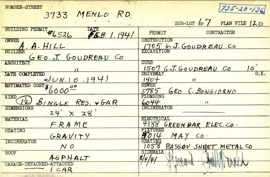 3733 Menlo Road Shaker Heights, OH 44120 PARCEL ID: 735-20-136 Building Permit Date: 02-01-1941 Neighborhood: Moreland Owner: Hill, A. A. Builder: George J. Goudreau Company Architect: George J. Goudreau Company Estimated Cost: 6000 Date Completed: 06-10-1941 Kind: Single Dwelling and Garage Material: Frame Heating: Gravity System Roof: Asphalt Garage: detached Blueprints: no blueprints on microfilm |