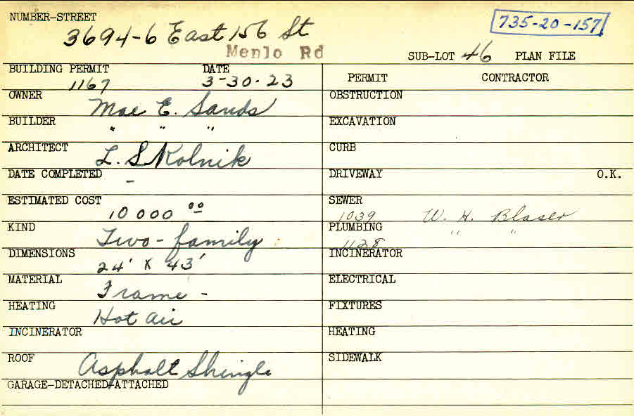 3694 Menlo Road Shaker Heights, OH 44120 PARCEL ID: 735-20-157 Building Permit Date: 03-30-1923 Neighborhood: Moreland Owner: Sands, Mae E. Builder: Sands, Mae E. Architect: Skolnik, Louis Estimated Cost: 10000 Kind: Duplex or Two-Family Material: Frame Heating: Hot Air Roof: Asphalt Shingles Blueprints: no blueprints on microfilm |