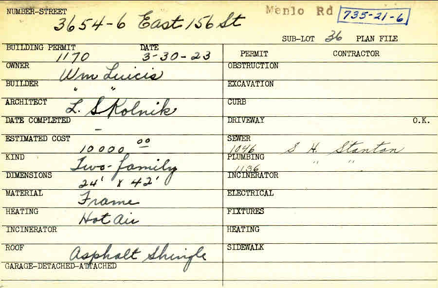 3654 Menlo Road Shaker Heights, OH 44120 PARCEL ID: 735-21-006 Building Permit Date: 03-30-1923 Neighborhood: Moreland Owner: Luicis, William Builder: Luicis, William Architect: Skolnik, Louis Estimated Cost: 10000 Kind: Duplex or Two-Family Material: Frame Heating: Hot Air Roof: Asphalt Shingles Blueprints: no blueprints on microfilm |