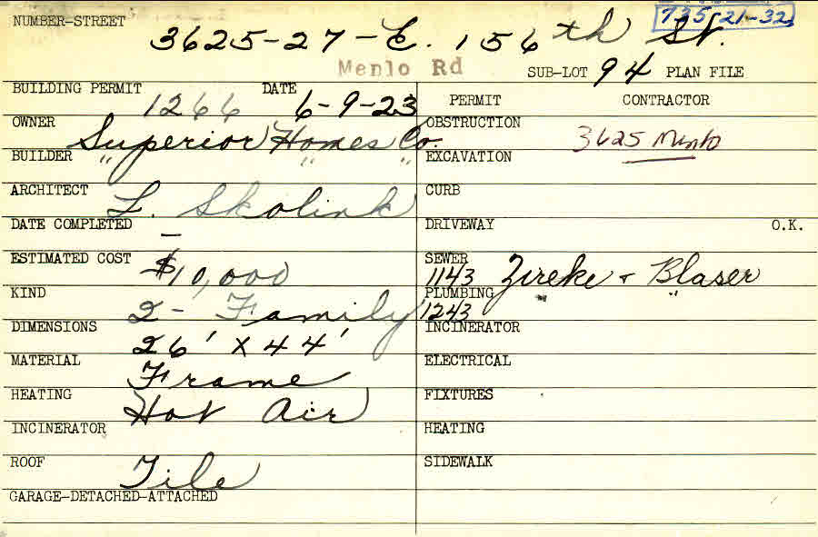 3625 Menlo Road Shaker Heights, OH 44120 PARCEL ID: 735-21-032 Building Permit Date: 06-09-1923 Neighborhood: Moreland Owner: Superior Homes Company Builder: Superior Homes Company Architect: Skolnik, Louis Estimated Cost: 10000 Kind: Duplex or Two-Family Material: Frame Heating: Hot Air Roof: Tile Blueprints: no blueprints on microfilm |