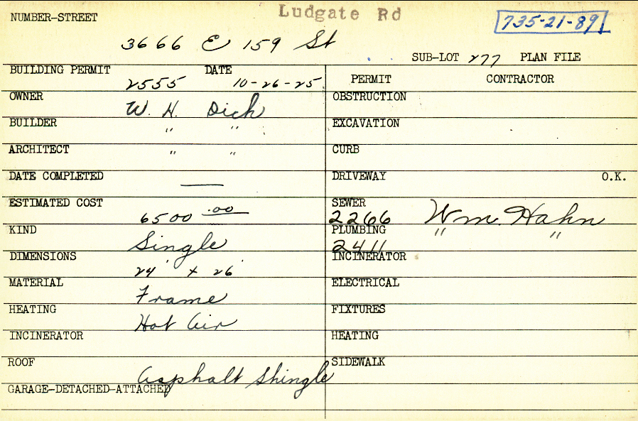 3666 Ludgate Road Shaker Heights, OH 44120 PARCEL ID: 735-21-089 Building Permit Date: 10-26-1925 Plan File Number: 0 Neighborhood: Moreland Owner: Dick, W. H. Builder: Dick, W. H. Architect: Dick, W. H. Estimated Cost: 6500 Kind: Single, Single Residence or Dwelling Material: Frame Heating: Hot Air Roof: Asphalt Shingles Card Available: yes |
