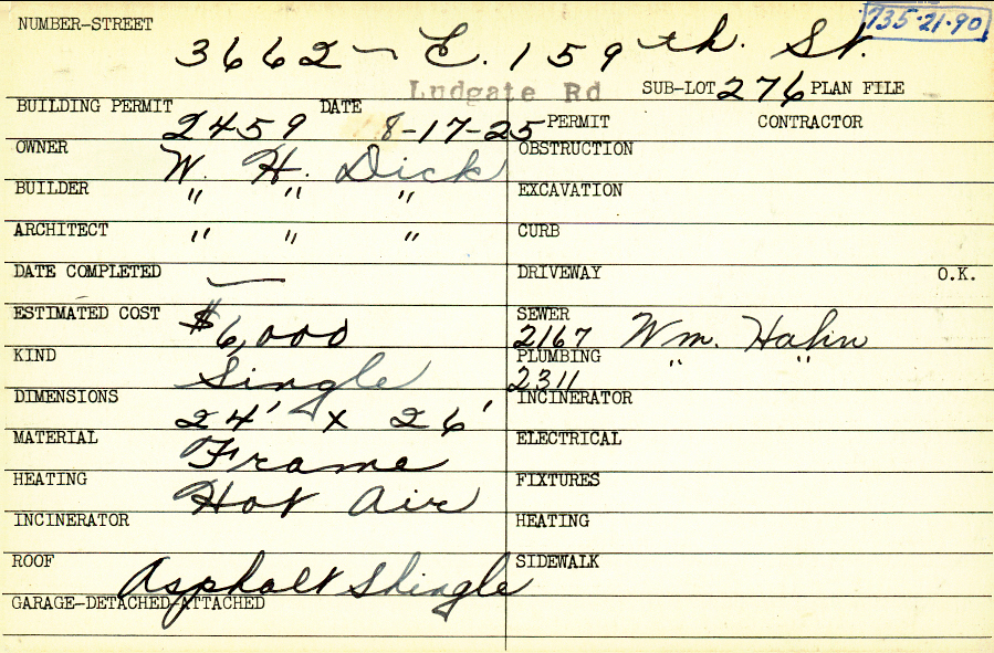 3662 Ludgate Road Shaker Heights, OH 44120 PARCEL ID: 735-21-090 Building Permit Date: 08-17-1925 Plan File Number: 916 all scanned Microfilm Roll: Roll012 Neighborhood: Moreland Owner: Dick, W. H. Builder: Dick, W. H. Architect: Dick, W. H. Estimated Cost: 6000 Kind: Single, Single Residence or Dwelling Material: Frame Heating: Hot Air Roof: Asphalt Shingles |