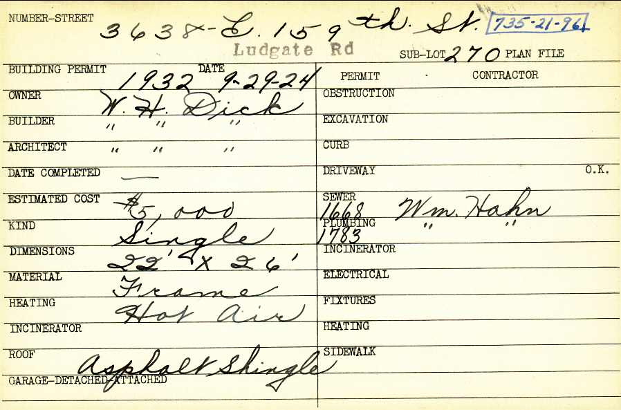 3638 Ludgate Road Shaker Heights, OH 44120 PARCEL ID: 735-21-096 Building Permit Date: 09-29-1924 Plan File Number: 0 Neighborhood: Moreland Owner: Dick, W. H. Builder: Dick, W. H. Architect: Dick, W. H. Estimated Cost: 5000 Kind: Single, Single Residence or Dwelling Material: Frame Heating: Hot Air Roof: Asphalt Shingles Card Available: yes |