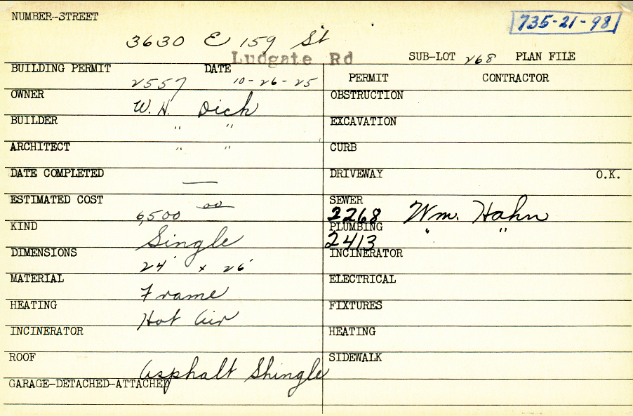 3630 Ludgate Road Shaker Heights, OH 44120 PARCEL ID: 735-21-098 Building Permit Date: 10-26-1925 Plan File Number: 0 Neighborhood: Moreland Owner: Dick, W. H. Builder: Dick, W. H. Architect: Dick, W. H. Estimated Cost: 6500 Kind: Single, Single Residence or Dwelling Material: Frame Heating: Hot Air Roof: Asphalt Shingles Card Available: yes |