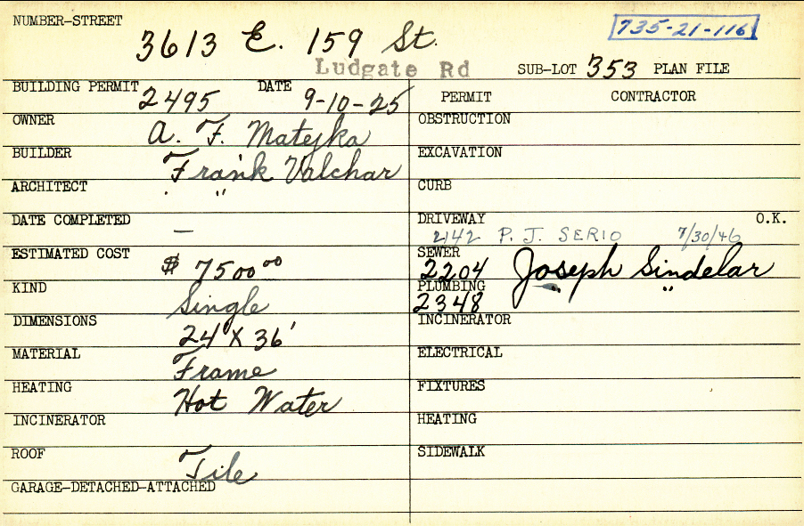 3613 Ludgate Road Shaker Heights, OH 44120 PARCEL ID: 735-21-116 Building Permit Date: 09-10-1925 Plan File Number: 0 Neighborhood: Moreland Owner: Matejka, A. F. Builder: Valchar, Frank Architect: Valchar, Frank Estimated Cost: 7500 Kind: Single, Single Residence or Dwelling Material: Frame Heating: Hot Water Roof: Tile Card Available: yes |