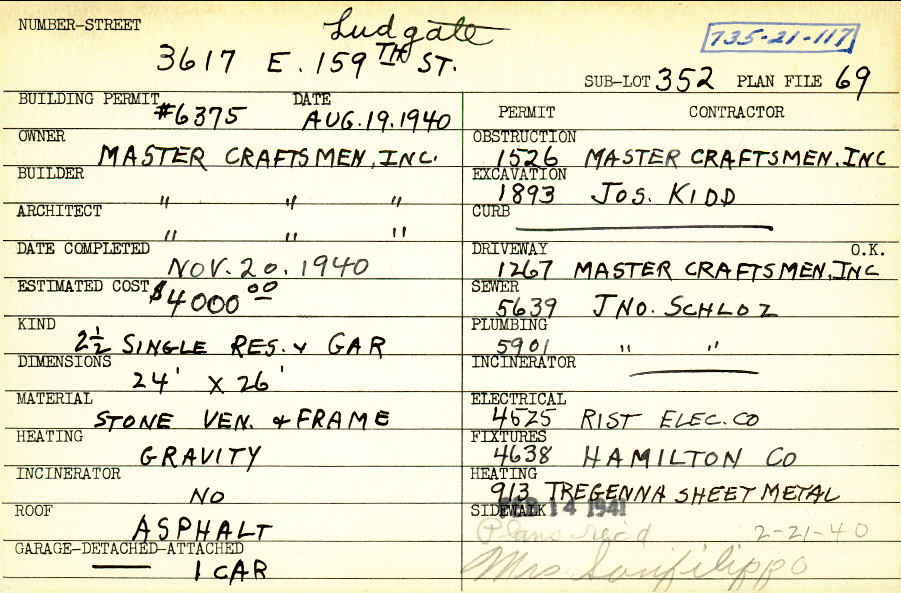 3617 Ludgate Road Shaker Heights, OH 44120 PARCEL ID: 735-21-117 Building Permit Date: 08-19-1940 Plan File Number: 69 Neighborhood: Moreland Owner: Master Craftsmen, Inc. Builder: Master Craftsmen, Inc. Architect: Master Craftsmen, Inc. Estimated Cost: 4000 Date Completed: 11-20-1940 Kind: Single 2-1/2 Material: Stone Veneer and Frame Heating: Gravity System Roof: Asphalt Garage: detached |