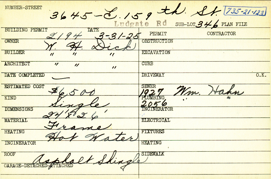 3645 Ludgate Road Shaker Heights, OH 44120 PARCEL ID: 735-21-123 Building Permit Date: 03-31-1925 Plan File Number: 12824 Microfilm Roll: NewRoll#18 Neighborhood: Moreland Owner: Dick, W. H. Builder: Dick, W. H. Architect: Dick, W. H. Estimated Cost: 6500 Kind: Single, Single Residence or Dwelling Material: Frame Heating: Hot Water Roof: Asphalt Shingles |