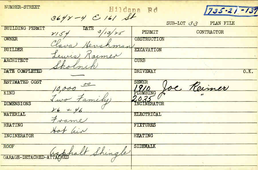 3642 Hildana Road Shaker Heights, OH 44120 PARCEL ID: 735-21-137 Building Permit Date: 03-13-1925 Neighborhood: Moreland Owner: Hershman, Clara Builder: Raimer, Lewis Architect: Skolnik, Louis Estimated Cost: 10000 Kind: Duplex or Two-Family Material: Frame Heating: Hot Air Roof: Asphalt Shingles Blueprints: no blueprints on microfilm |