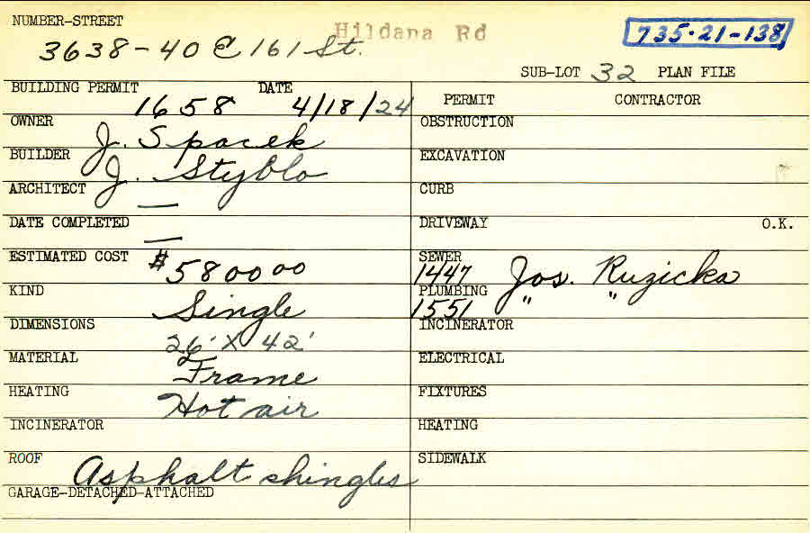 3638 Hildana Road Shaker Heights, OH 44120 PARCEL ID: 735-21-138 Building Permit Date: 04-18-1924 Plan File Number: 0 Neighborhood: Moreland Owner: Spacek, J. Builder: Styblo, J. Estimated Cost: 5800 Kind: Single, Single Residence or Dwelling Material: Frame Heating: Hot Air Roof: Asphalt Shingles Card Available: yes |