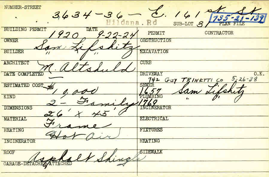 3634 Hildana Road Shaker Heights, OH 44120 PARCEL ID: 735-21-139 Building Permit Date: 09-22-1924 Plan File Number: 7109 Microfilm Roll: Roll#91 Neighborhood: Moreland Owner: Lifshitz, Sam Builder: Lifshitz, Sam Architect: Altshuld, M. Estimated Cost: 10000 Kind: Duplex or Two-Family Material: Frame Heating: Hot Air Roof: Asbestos Shingles |