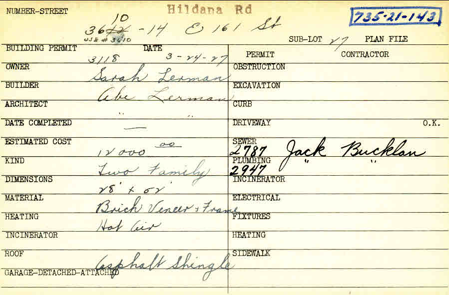 3610 Hildana Road Shaker Heights, OH 44120 PARCEL ID: 735-21-143 Building Permit Date: 03-24-1927 Plan File Number: 0 Neighborhood: Moreland Owner: Lerman, Sarah Builder: Lerman, Abe Architect: Lerman, Abe Estimated Cost: 12000 Kind: Duplex or Two-Family Material: Brick Veneer and Frame Heating: Hot Air Roof: Asphalt Shingles |